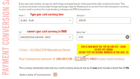 • We accept payments only in Macedonia Denars (MKD), please use Mastercard calculator to calculate/convert your currency in (MKD). Please check the image bellow for reference.